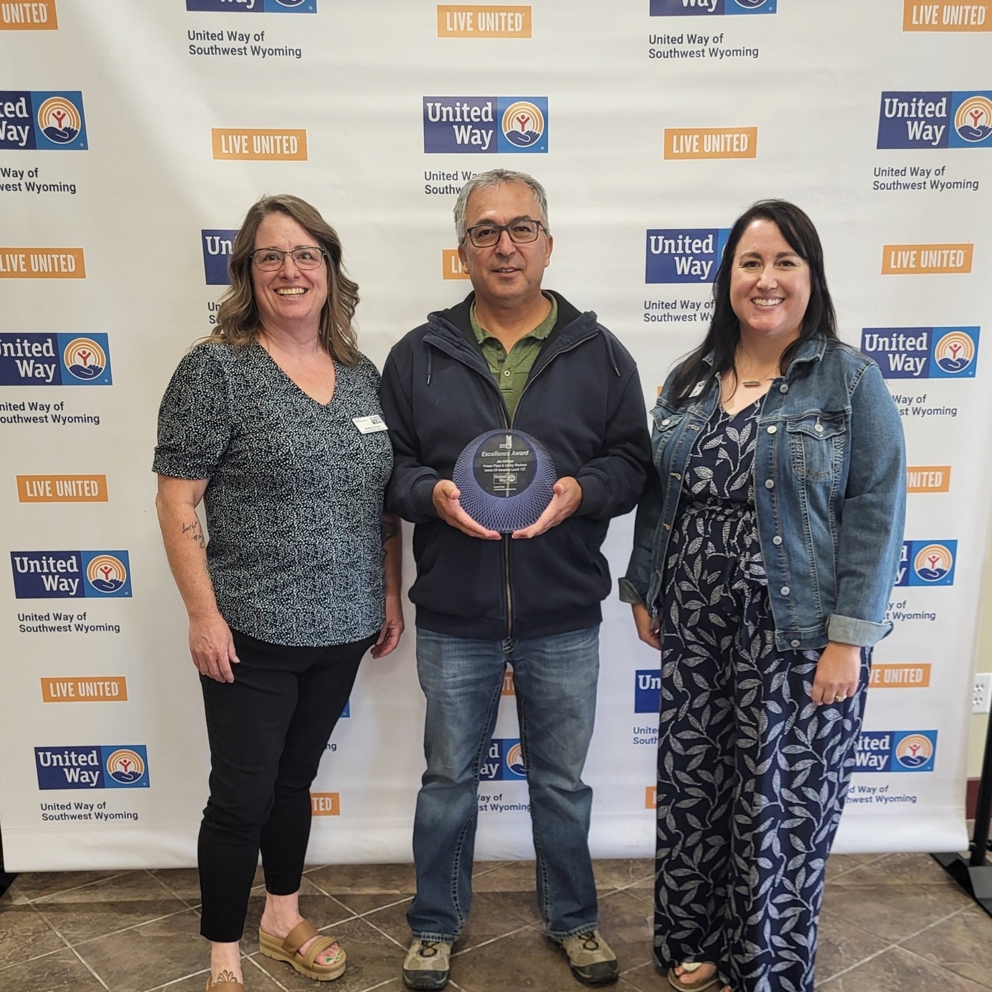 Excellence Award: Joel Reyes, the 2024 campaign lead for Jim Bridger Power Plant accepted the 2023 Excellence Award on behalf of Jim Bridger Power Plant its employees and Utility Workers Union of America Local 127. Also pictured are Shelley Richno, Community Impact Coordinator and Kelly Frink, Executive Director.